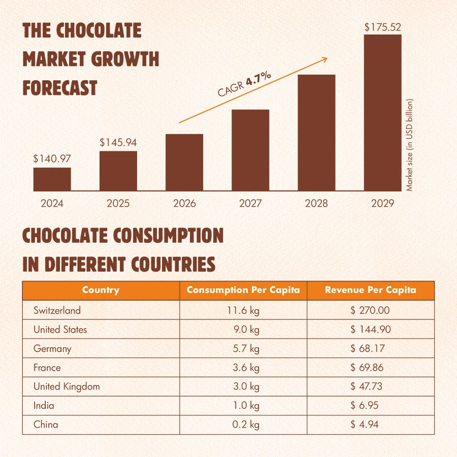 The global chocolate market is experiencing powerful, sustained growth, projected to rise from $140.97 billion in 2024 to $175.52 billion by 2029, driven by a strong CAGR of 4.7%.