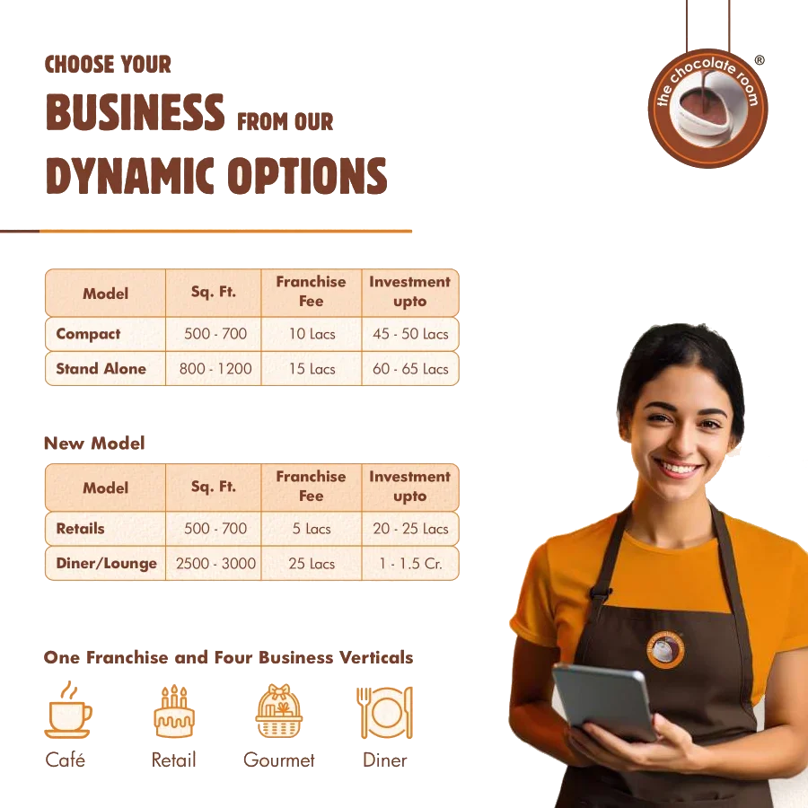 Franchisees can expand into multiple verticals: Café, Bakery, Retail, Diner, and Hampers. With a growing chocolate market expected to reach $175 billion globally by 2029, and a rising café culture in India, partners can scale to multiple outlets and enjoy long-term, compounded growth.